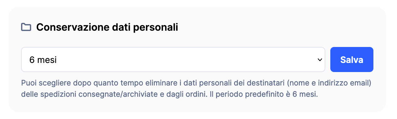 Ad esempio, se imposti come periodo 6 mesi, dopo 6 mesi dalla consegna/archiviazione di una spedizione o dall'importazione di un ordine rimuoveremo i dati. Le spedizioni archiviate resteranno comunque consultabili, ma senza i dati del destinatario.