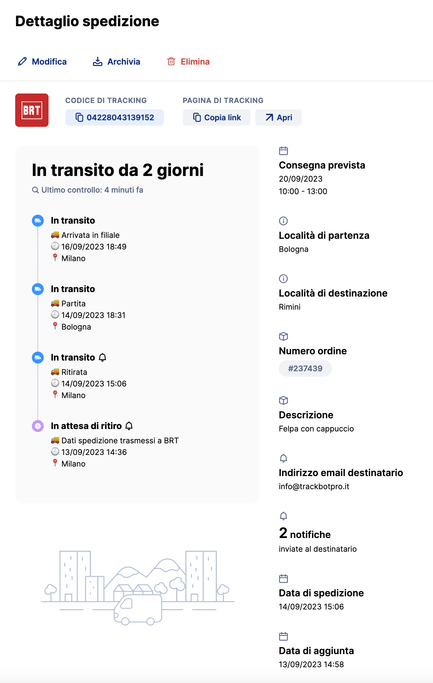 Nella pagina dettaglio sono mostrate tutte le informazioni sulla spedizione. Da questa pagina è possibile anche modificare, archiviare o eliminare la spedizione.