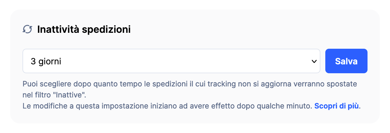 Lo stato non è abilitato automaticamente ma va configurato tramite le impostazioni, dove puoi scegliere il numero di giorni dopo cui le spedizioni entrano nello stato Inattive.